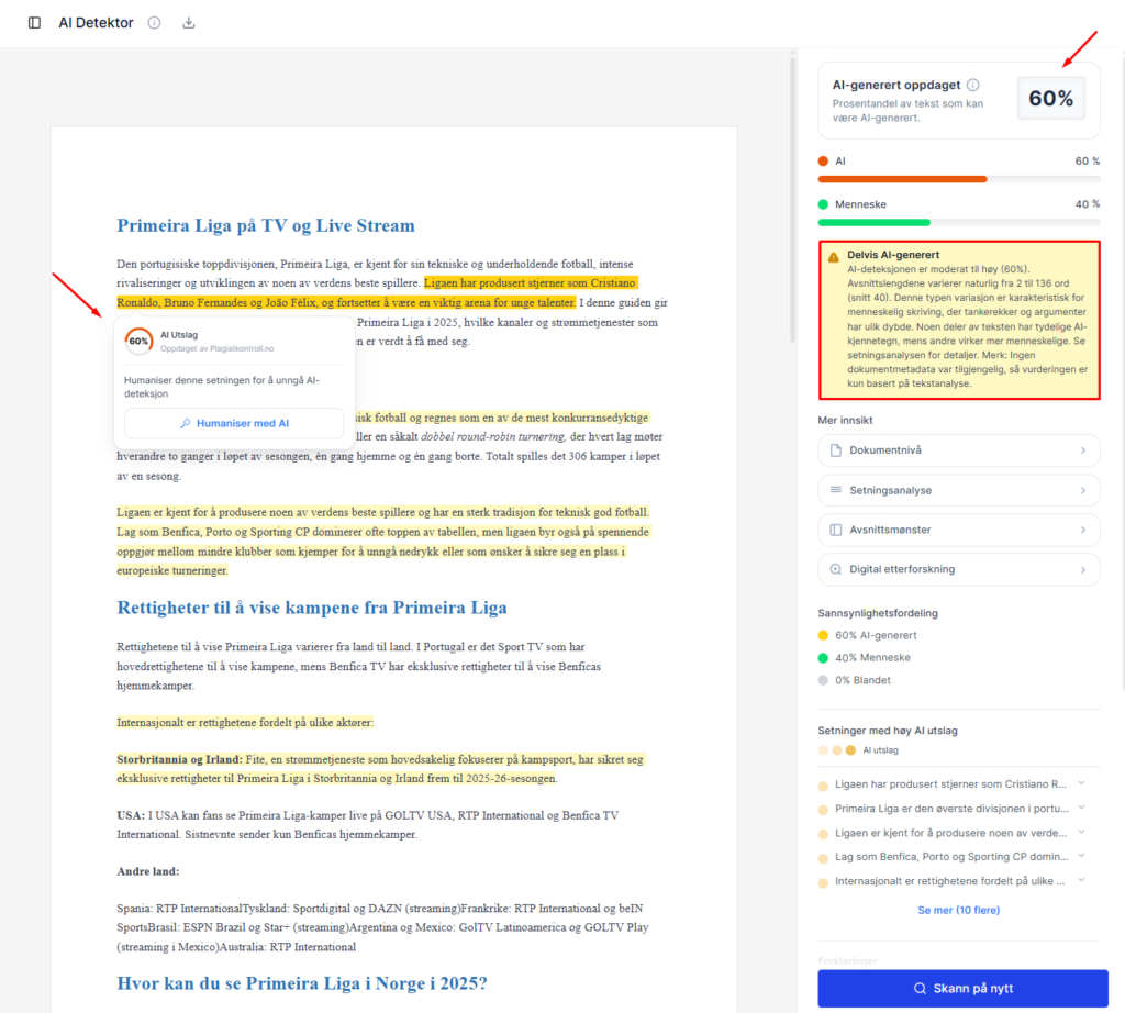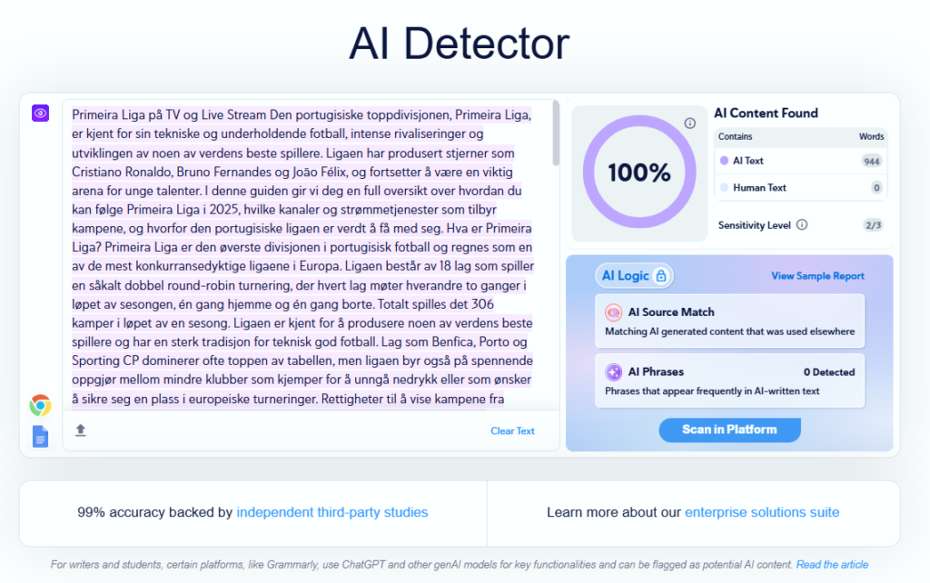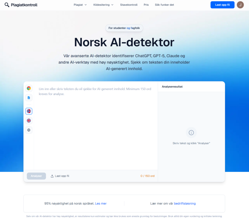 Plagiatkontroll.no er i denne sammenligningen det mest overbevisende valget for norske lærere og elever. Tjenesten bygger på en egen modell trent med norsk kontekst, og leverandøren kommuniserer at treffsikkerheten for norsk ligger omkring 95 % – et tall du bør lese som laboratoriemål på deres datasett, ikke som garanti i hver enkelt mappe. Poenget er like fullt at en slik tilnærming reduserer typisk «engelsk bias»: du slipper i større grad at korrekt, konsistent norsk blir feilaktig tolket som «for maskinelt» bare fordi modellen ikke kjenner språket godt nok.