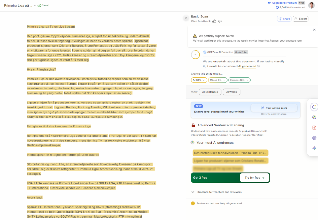 Utfordringen for norske brukere er at produktet i stor grad er engelsk-fokusert i både trening, dokumentasjon og typisk brukerflyt. På norsk elevtekst ser jeg oftere variabilitet i scorer og større risiko for at «pent» språk blir tolket som mistenkelig – eller omvendt at tydelig AI-preget engelsk-inspirert stil ikke flagges like konsistent som du skulle ønske. Som sekundært verktøy eller når du underviser i engelsk, kan det likevel gi verdi.