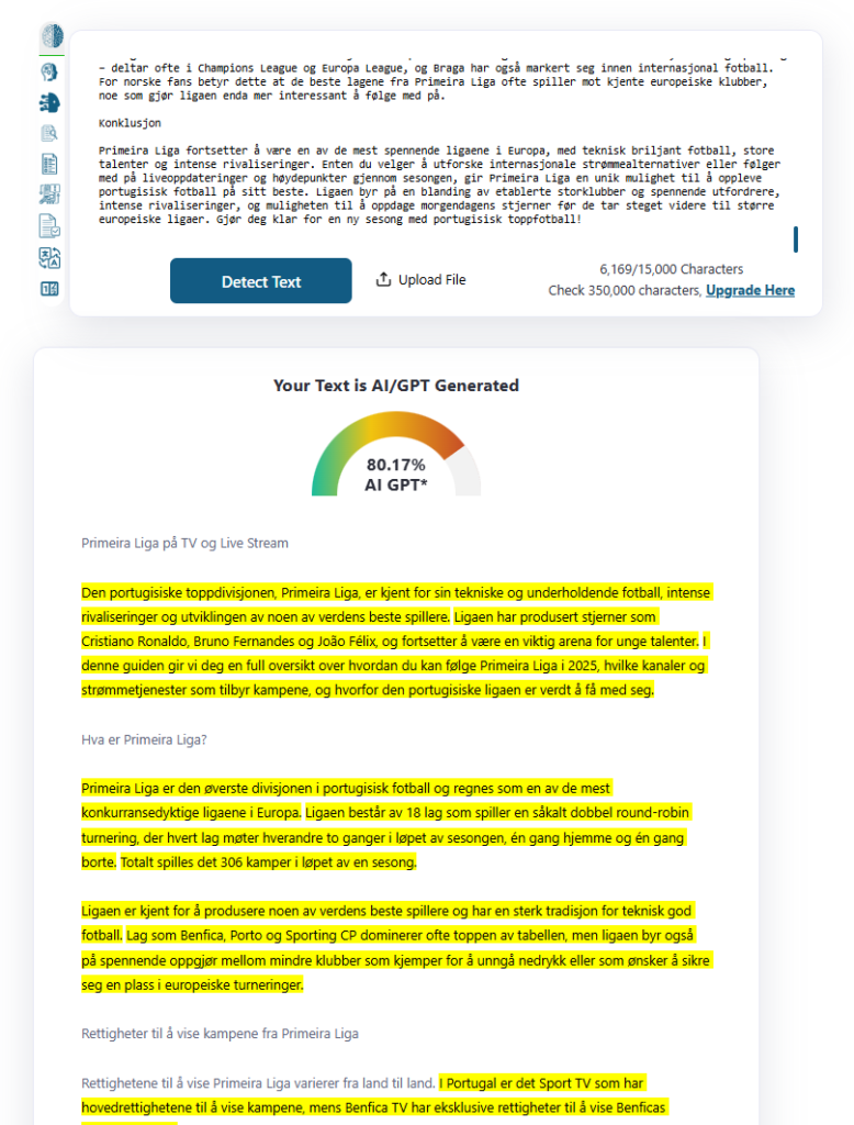 GPTZero er et av de mest kjente navnene globalt, og mange skoler har hørt om det gjennom media eller kolleger. Grensesnittet er profesjonelt, og rapportene kan være nyttige når du jobber med lengre engelske tekster eller trenger et visuelt overslag som du kan diskutere i fagteam.
